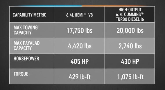 | Specification | 6.4L HEMI® V8 | High-Output 6.7L Cummins® Turbo Diesel I6 |